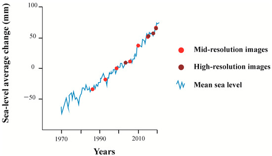 Mean sea-level fluctuations between 1970 and 2020 with satellite imagery acquisition dates (points) from this study. Modified from Lindsey [83].