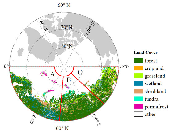The Subarctic study area and the three regions. Data source: ESA Land Cover Data. A is the East European and West Siberian Plain; B is the Central Siberian Plateau; C is the East Siberian Highlands.