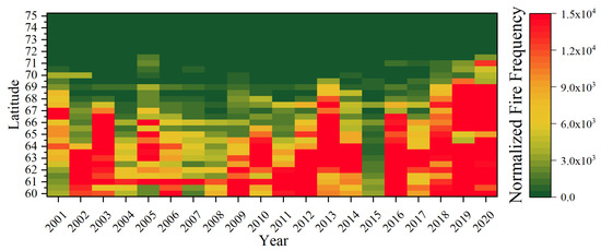 For the generation of maps of numbers of fire pixels per latitude band (Figure 2), it was necessary to account for the progressively reduced area with increasing latitude. The normalized number of fires pixels was calculated as (n/A) × S, where n denotes the number of fire pixels in a latitudinal band, A denotes the area of land covered by this band (km2), and S is a scaling factor (1,000,000) to rescale the values to a more convenient range.