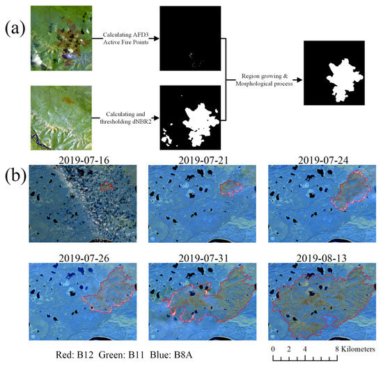 The automatic extraction of the burnt land perimeter for our custom fire dataset uses spectral indices, region growing, and morphological processing. The overall procedure is shown schematically in Figure 4a. Based on the location and time information of fire pixels in the coarse resolution data for the period 2017 to 2021 (i.e., 5 years), 16,019 tiles of Sentinel-2 L2A product, each 5490 × 5490 pixels, were downloaded from the Copernicus Open Access Hub (https://scihub.copernicus.eu/dhus/#/home (accessed on 1 December 2021)). These tiles cover the study area and the adjacent high-latitude area. Some tiles were not suitable for fire perimeter extraction due to clouds or the tile only including many pixels that were not imaged. In addition, fires recorded in only a single time period were excluded. Finally, we manually checked all the downloaded tiles for data quality and obtained 2260 effective tiles to track the 719 fires.