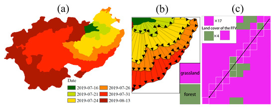 Fire front vectors. (a) An example of the progression of a single fire and (b) the associated fire front vectors for a portion of the fire. (c) Determination of land-cover type of an FFV. In this example, the FFV is assigned to grassland.