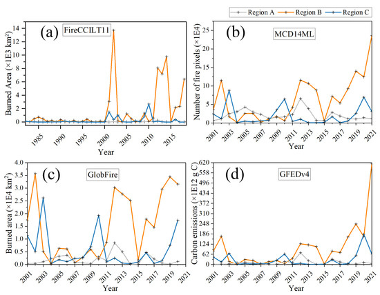 - For region C, which covers the East Siberian Highlands, the fire frequency, burnt area, and biomass burning carbon emissions show a marked periodicity. The time series is characterized by a majority of years with relatively low fire frequency, burnt area, and carbon emissions, punctuated by intermittent years with unusually high values in 2003, 2010, and 2020. The preceding 1–2 years before each peak in the active fire numbers are also typically elevated, though substantially lower than the peak.