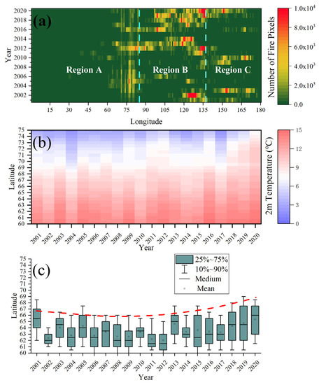 Figure 7a, derived from the MCD14ML data [16], explores the temporal evolution from 2001 to 2020 of fires within longitudinal bands. The number of active fire points is variable along the longitudinal gradient with West Siberian Plain (region A) exhibiting the lowest value, the Central Siberian Plateau (region B) showing the highest value, and the East Siberian Highlands (region C) showing more interannual variability in number of active fire points (Figure 7a). The figure also shows that the boundary between the regions A and B is gradational, with fire generally more frequent east of ~60° compared to the rest of region A. In Figure 7c, the second-order polynomial curve for the locations of the whiskers representing 90% of fire pixels for each year (red dashed line) indicates that the northern limit of most fires in the Eurasian Subarctic was relatively stable between 2001 and 2012 at approximately 66.0° but then moved northward gradually from 2013 onwards. These interpretations were evaluated using null-hypothesis significance testing. The slope of the trend line of 90% whiskers between 2001 and 2012 is not significantly different from zero (p-value: 0.34), and the slope of the trend line of 90% whiskers between 2013 and 2020 is significantly different from zero (p-value: 0.03). Furthermore, the median latitude of the northern limit of fires between 2013 and 2020 is 1.5° higher than it was between 2001 and 2012 (67.5° vs. 66.0°N). In Figure 7b, the temporal evolution of the median summer air temperature at 2 m above the ground surface (T2M) of the 30 latitudinal bands shows a similar trend of increasing values at high latitude. Indeed, the summer T2M and the number of fire pixels for the region between 60 and 75°N has a correlation coefficient of 0.6.
