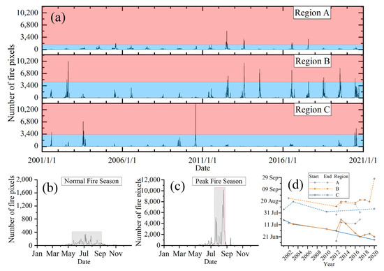 For convenience, we also distinguish peak fire season in a high fire incidence year as the region shown as the gray shaded box in Figure 8c (see methods section for further detail on how this region is defined). Peak fire seasons usually have a shorter period duration than normal fire seasons in low fire incidence years (shown as the gray shaded box in Figure 8b); the latter is typically five months long, from May to September. Figure 8d shows the start and end dates of peak fire season for high fire incidence years in the three regions. Peak fire season in the three regions generally starts between late June and mid-July. The start dates of peak fire season in regions B and C advanced (i.e., are earlier in the year) at the rate of 1.40 and 1.64 days per year, respectively, with p-values from null-hypothesis significance testing (H0: the slope of the trend line is equal to zero) of 0.04 and 0.01, respectively. Region B is notable for the longer duration of the peak fire season, 54 days on average, compared to, respectively, 32 days and 33 days for regions A and C. In addition, in Region B, there is a general trend of a longer period of peak fire in recent years, with an earlier start time and later end time. According to the daily dynamics of active fires (Figure 8a), the number of active fire pixels generally peaked in July, agreeing with the results of Valendik [27].