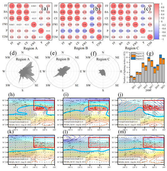 Weather factors affecting patterns of fires. (a–c) Correlation coefficient maps among FF (fire frequency, source: MCD14ML), BA (burnt area, source: GlobFire), CE (carbon emissions, source: GFEDv4), FWI (fire weather index, source: ERA5 reanalysis), P (precipitation, source: GPCP monthly mean precipitation rates v2.3), T2M (2 m temperature, source: ERA5-Land) in three regions, A, B and C. (d–f) Wind roses for the three regions (June-October). (g) The annual number of lightning strokes in the three regions from 2010 to 2021. (h–m) Averaged weather maps at upper air (500 hPa) in fire season. The isoline (5680 m) is thickened to highlight the pattern of the westerlies. The red rectangle represents the extent of region C. Red pixels represent fire pixels. (h–j) High fire incidence years (2003, 2010, 2020). (k–m) Low fire incidence years (2006, 2014, 2018).