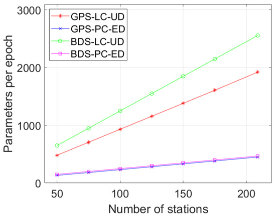 Due to the huge estimable parameters, the real-time clock cannot reach the 1 Hz update rate using the UD model. The ED model can eliminate a mass of ambiguity parameters, and the calculation is efficient. However, the introduced initial satellite clock offset exists deviations. The MD model combines the characteristics of the two models. Therefore, as long as appropriate hardware and global stations are selected, the MD model can fully attain the increasing parameters of BDS-3 satellites or other GNSS systems to estimate real-time clock offset. Figure 1 shows the comparison between the number of stations and the number of estimated parameters.