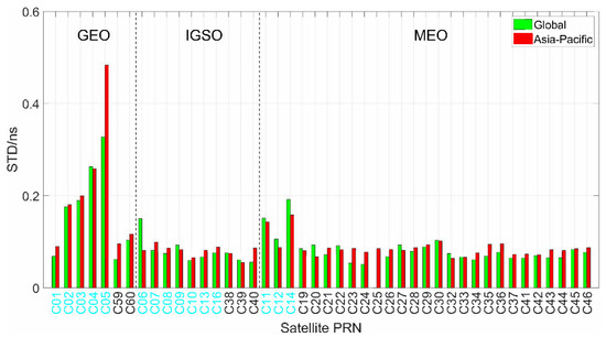 From Figure 3, we can see that most clock offset results estimated in the global are more concentrated than that of the Asia-Pacific. The reason that the clock offset results estimated in the Asia-Pacific are slightly dispersive is due to the fewer regional stations, the shorter arcs involved in the calculation, and the poor continuity of the observation data. For more comparison and convenient statistics, the calculation results of each BDS satellite in DOY 214–243 are averaged to obtain the accuracy of multiple days, as shown in Figure 4. The satellite number marked as bright cyan indicates the BDS-2 satellites, while the satellite number of BDS-3 satellites are presented in black.