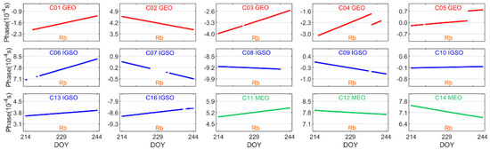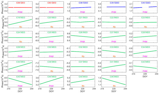 The phase series of each BDS satellite atomic clock are obtained by fitting the precision clock as shown in Figure 5 and Figure 6. It can be seen that the phase series of BDS satellite atomic clocks jumps in some periods.