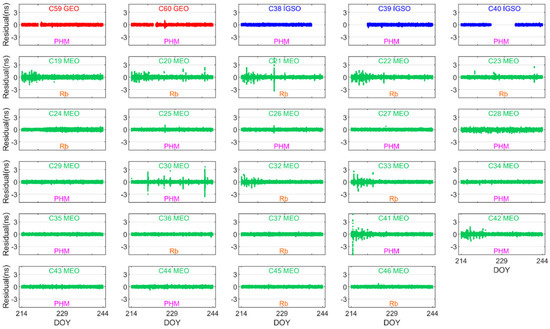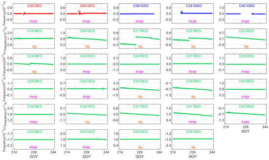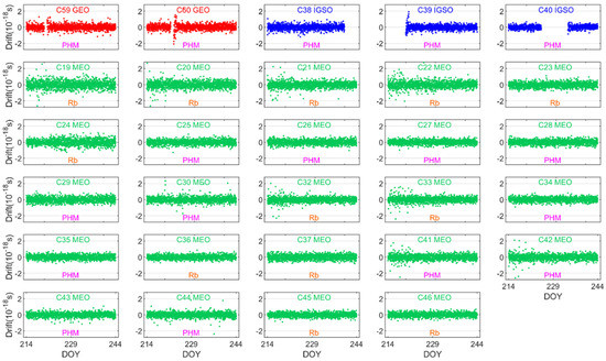 The globally estimated satellite clock offset has sufficient data as compared to that of the Asia-Pacific, and thus this paper selects the former dataset to study and analyze the physical characteristics of satellite atomic clocks. In the following, GEO satellites are presented in red, IGSO satellites in blue, and MEO satellites in green. The Rb atomic clocks are marked in orange, and the PHM atomic clocks are marked in manganese violet.