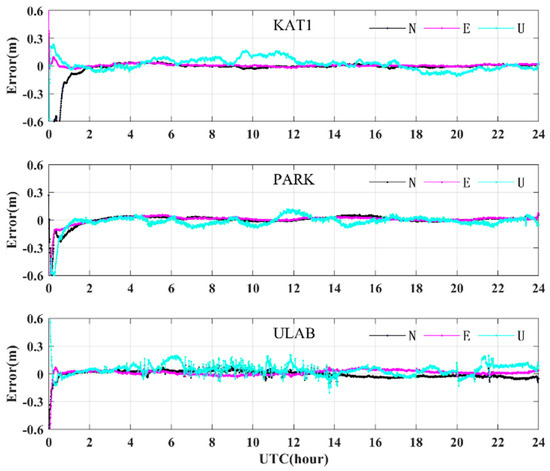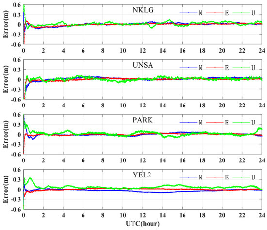 The convergence is defined as the positioning deviation of horizontal directions and the vertical direction within 10 cm for 20 consecutive epochs, and the RMS of positioning deviation after the convergence of kinematic positioning is regarded as the positioning accuracy. The clock offset estimated in the global and Asia-Pacific is used to participate in the kinematic PPP, and some representative positioning results are shown in Figure 16 and Figure 17.