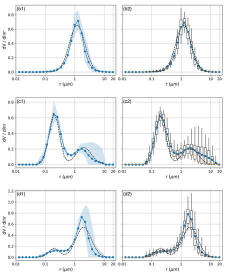 Figure 1 shows the comparisons between the retrieved and true VSDs when and . The left column (Figure 1a1–d1) represents the results when the synthetic optical data were free of error (error-free), while the right column (Figure 1a2–d2) shows the statistics of the results when measurement error is considered (error-contaminated), which is accomplished by adding the error vector to the optical data and inverting the error-contaminated optical data 100 times. The elements of the error vector are independent of each other and conform to the Gaussian distribution: . From Figure 1, it is seen that there are larger dispersions in the coarse mode than in the fine mode for both error-free and error-contaminated optical data. This can be explained by the fact that the backscattering kernels decrease rapidly if the particle radius exceeds 2–3 μm [25], which undermines the contribution of the coarse mode to total backscattering when both modes exist.