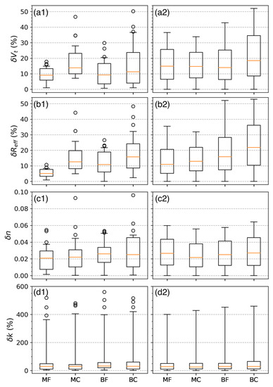 Figure 2 shows the statistics of the absolute retrieval differences (the absolute value of retrieval difference, which is always positive) of CRIs, , and for all the scenarios in Table 1. In general, compared with other aerosol types, retrieval differences for MF aerosols have the lowest medium values and smallest dispersions, representing the best retrieval accuracies among the four VSD types. On the other hand, BC aerosols have the largest dispersions in and , which likely results from the errors in coarse-mode retrieval. For different retrieval parameters, measurement error enlarges the retrieval dispersion to various extents, influencing and more than n and k. In particular, the dispersions of are nearly the same with and without measurement error. Figure 3 shows in detail the distribution of , from which we see when , regardless of the VSD type and . This is because in these scenarios, the retrieved values of k are all close to . Such retrieval difficulty is also faced in linear regularization methods [62]. Retrieval accuracy of k improves with the increase of and with getting close to . For example, smaller than 10% can be derived when and for all types of size distributions.