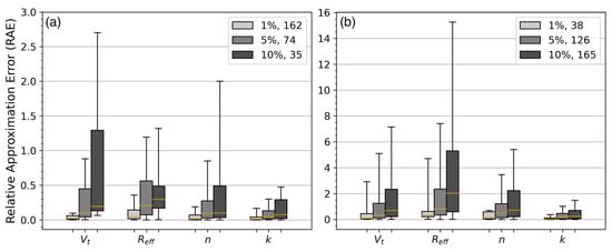 Relative approximation error (RAE) of Vt, Reff, n, and k for MF aerosols in Table 1. (a) The results of which the iteration number does not change after the introduction of perturbation; (b) the results of which the iteration number changes after the introduction of perturbation. The magnitudes of perturbations (1%, 5%, and 10%) are labeled in the legend, followed by the counts of the cases. The hinges and horizontal lines from the bottom to top of the box-and-whiskers plots represent 0, 25, 50, 75, and 90 percentiles of the dataset.