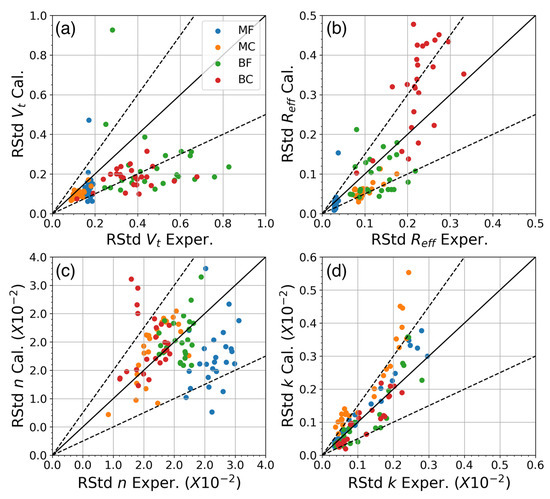 Case-by-case comparison of the retrieval standard deviation (RStd) of (a) Vt, (b) Reff, (c) n, and (d) k calculated with the propagation model for a measurement uncertainty of 10% (y-axes) and derived from the statistics of the 100 inversions of error-contaminated optical data (same as the method described in Section 3.2) (x-axes). For each VSD type, individual solutions are derived for suitable inversion windows. In each panel, the black solid line represents the 1–1 line, and between the two dashed lines is the area where relative error is less than 50%.