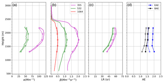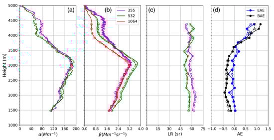 LILAS measurements (solid lines) and the measurements recalculated from the retrievals (dashed lines) on 10 April 2015, in the period of 00:00–02:00 UTC, at Dakar. (a) Extinction coefficients (α); (b) backscattering coefficients (β); (c) Lidar ratios (LRs), and (d) Angstrom exponents of 355 nm over 532 nm (AE355–532), including extinction Angstrom exponent (EAE355–532) and backscattering Angstrom exponent (BAE355–532). The layer 1500–4400 m was selected and resampled for the retrieval. Measurements at different wavelengths are represented by the corresponding colors.