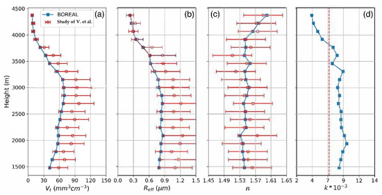 Comparison of retrieval results derived by BOREAL from Figure 6 (blue solid lines) and presented in Veselovskii et al. [64] (red hollow circles). (a) Vt; (b) Reff; (c) n, and (d) k. The study in Veselovskii et al. [64] did not provide the profile of k but an approximated value of 0.007 for the whole dust layer (red dashed line). Because the particles are all assumed to be spheroids, results in Table 3 cannot be used here as estimates of retrieval accuracies.