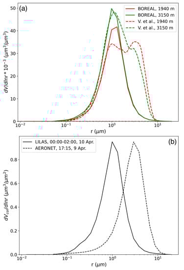 Comparison of VSD retrieval. (a) Comparison between the VSDs retrieved by BOREAL (solid lines) and presented in Veselovskii et al. [64] (dashed lines) at 2 concentrated levels, the “*” in the label of the ordinate means the multiplication symbol; (b) VSDs retrieved from the vertical-integrated LILAS measurements (1500–4500 m, solid line) and from AERONET measurement at 17:15 UTC, 9 April (dashed line).