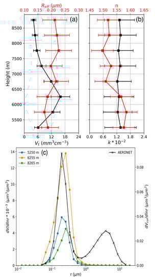 Retrievals for Case 3. (a) Profiles of Vt and Reff; (b) profiles of n and k; and (c) comparison of layer-resolved VSDs from the LILAS/BOREAL retrieval and column-integral VSD from the AERONET retrieval at 16:28 UTC, 30 May 2020. The error bars in (a,b) are extracted from Table 3.