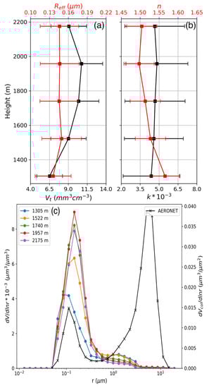 Retrievals for Case 2. (a) Profiles of Vt and Reff; (b) profiles of n and k; and (c) comparison of layer-resolved VSDs from the LILAS/BOREAL retrieval and column-integral VSD from the AERONET retrieval at 13:55 UTC, 11 September 2020. The error bars in (a,b) are extracted from Table 3.