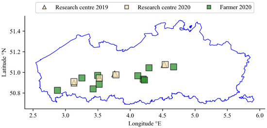 In both 2019 and 2020, multiple fields across Flanders, Belgium, were planted with leeks (Allium porrum) (Figure 1). In 2019, the experiments were spread across four fields at agricultural research stations (ILVO, Inagro, PSKW, and PCG). The leeks were planted between 19 June and 28 June and harvested between 4 December 2019, and 10 February 2020. All fields were planted with the Pluston variety (Nunhems Netherlands BV, Nunhems, The Netherlands). In addition to the research centres, leek cultivation at ten fields from ten different farmers were also included in the experiments in 2020. The leeks were planted between 29 May and 31 July 2020 and harvested between 12 October 2020 and 24 April 2021, depending on the location. The farmers cultivated several varieties, sometimes even two within one field (Table 1). At the research stations, only the Pluston variety was planted. At the research stations, different fertilization strategies were applied, which were determined as variants of the strategies proposed by the updated KNS advisory system for Flemish soils [24,25]. In 2019, mineral fertilizers were applied at planting and 7 to 9 weeks after planting in the form of calcium ammonia nitrate (CAN). The total amount of applied fertilizers at the research stations varied from 0 kg N/ha to 247 kg N/ha in 2019. In 2020, the total amount of mineral fertilizers varied from 0 kg N/ha to 157 kg N/ha. The farmers applied their standard management homogeneously throughout the field. The applied fertilizers consisted of initial fertilization with organic fertilizer or manure and a side-dress with mineral fertilizers. Some farmers planted multiple varieties in their fields (Table 1). All fields were grown under rain-fed conditions. Only at the research station of PSKW irrigation was applied.