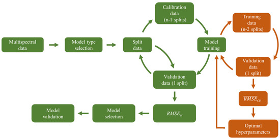 The workflow to estimate, select and validate the models is illustrated in Figure 2. The models were trained using the data that was acquired during the field trials in 2019. Cross-validation (CV) was used to quantify the ability of the model to predict crop DBM and nitrogen uptake throughout the leek development. As the observations acquired at each sampling moment and location are not independent due to similar soil, weather conditions and MS-sensor calibration during each flight, random CV-splits might lead to over-fitting models, poor generalization, and thus poor model selection [45,46]. To obtain a reliable estimate of the prediction performance for a new flight, a leave-one-flight out cross-validation (LOF-CV) scheme was used. In each iteration, the data was split such that all data from one flight were set aside to validate the model, while the data from the other flights were used to train the model. The parameters of the SLR were estimated through ordinary least squares. The other methods require specification of one or multiple hyperparameters. These hyperparameters were optimized through the minimization of the root mean squared error cross-validation (RMSEcv) (Equation (2)) on the training data. So, the data of the remaining n−1 flights to train the model were iteratively split in a training set of n−2 flights and a validation set containing all data from the remaining flight. For the PLSR model, the number of latent variables was selected as the number with the lowest RMSEcv. For the lasso model, the regularization parameter was optimized. Before the estimation of the Lasso or PLSR model, the predictor variables were scaled to zero mean and unit standard deviation. For the SVR model, only the RBF kernel was considered. The kernel scaling factor (gamma), ε and L2-regularization parameters were optimized. For the RFR model, the number of regression trees, the minimal number of observations at each leaf, the maximal number of predictors used and the maximal depth of each tree were optimized. For the xGBR model, the following hyperparameters were tuned: the number of regression trees that were used, the maximal tree depth, the minimum reduction in the loss function value, learning rate, L2 regularization weight and the number of predictors used to build the trees. The hyperparameters for the SVR, RFR and xGBR models were optimized through Bayesian optimization using the scikit-optimize package (v0.8.1).