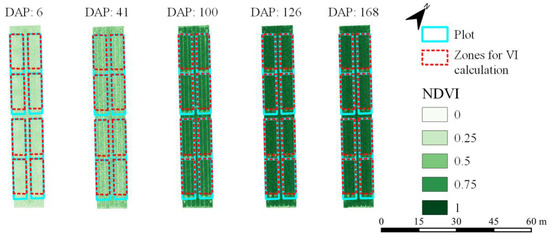 Image stitching and radiometric calibration were carried out by an automated processing pipeline developed by the Flemish Institute for Technological Research (VITO, Mol, Belgium) (https://mapeo.vito.be/en accessed on: 7 September 2021). These processes resulted in an ortho-mosaic with five spectral bands (blue: 475 nm, green: 560 nm, red: 668 nm, rededge: 717 nm, and near-infrared (NIR): 842 nm). The GSD was not consistent across all flights due to different flight altitude settings and small variations between the actual flight and the set altitude. Therefore, all ortho-mosaics were resampled to the largest GSD of all flights (31.2 mm), using the average resampling implemented in Rasterio (v1.1.3) [27]. From the five resulting spectral reflectance bands, twelve vegetation indices (VIs) were calculated: the normalized difference vegetation index (NDVI), normalized difference rededge index (NDRE), green NDVI (GNDVI), blue NDVI, red wide-dynamic range vegetation index (RWDRVI), blue WDRVI (BWDRVI), Meris terrestrial chlorophyll index (MTCI), modified chlorophyll absorption in reflectance index (MCARI), canopy chlorophyll content index (CCCI), chlorophyll index green (CI-green), chlorophyll index rededge (CI-rededge) and soil adjusted vegetation index (SAVI) (Table 2). These indices were first calculated at pixel level and subsequently aggregated by calculating the median and interquartile range (iqr) from all pixels within an experimental plot, as the extraction of plant pixels did not improve the model accuracy [28].