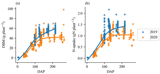 The evolution of (a) the DBM (g plant−1) and (b) the N-uptake (gN plant−1) across all experimental plots in 2019 (blue) and 2020 (orange) in function of the days after planting. The solid line is a lowess smoother.