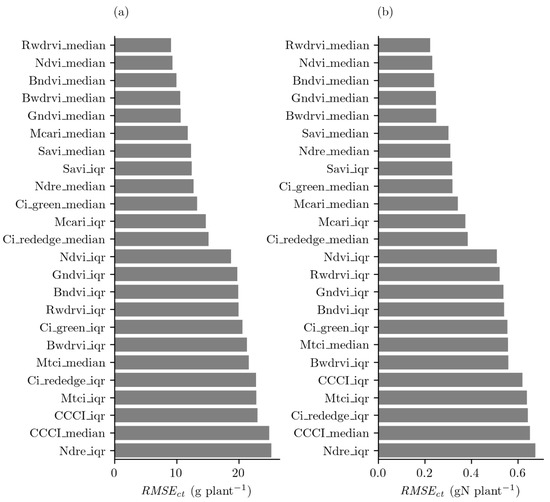 For both N-uptake and DBM, 24 SLR models were built (Figure 5). The DBM was most accurately predicted by the RWDRVI model with an RMSEct of 9.08 g plant−1 (Figure 5a). The median NDVI and BNDVI had only a slightly increased RMSEct, 9.37 and 9.96 g plant−1, respectively. The N-uptake was also most accurately predicted by the RWDRVI model with an RMSEct of 0.22 gN plant−1. The SLR models using the median NDVI, BNDVI, GNDVI and BWDRVI had a similar accuracy (Figure 5b). The RMSEct only varied from 0.23 to 0.25 gN plant−1. The N-uptake and DBM were both least accurately estimated using the iqr of the NDRE; the RMSEct was equal to 0.67 gN plant−1 and 25.26 g/plant, respectively. However, the relationship between the observed and predicted values in LOF-CV was significant (p < 0.001). Only the iqr of the MTCI index resulted in a non-significant linear model for both DBM (p = 0.05) and N-uptake (p = 0.08) estimation. More complex models were trained and compared to the best performing SLR model to evaluate whether the information contributed by multiple VIs could provide more accurate predictions.