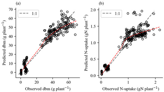 Scatter plots of predicted versus observed values for (a) leek DBM using the Lasso model and (b) leek N-uptake using the SLR model based on the median RWDRVI. The red dotted line shows the lowess smoother for the predictions.