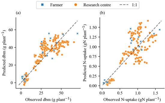 The predicted dbm (a) and N-uptake (b) in function of their observed values at the research centres (orange dots) and farmer fields (blue crosses) from the experiments in 2020.