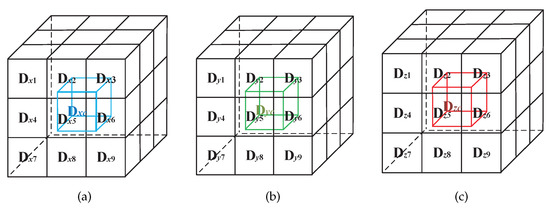 Taking a 3 × 3 × 3 region of the HSIs as an example, let the pixel locations in the center of the region within have the values . Let the value of the pixel point in the direction within be . It may be noted that is defined as the sum of the values of the pixel points in the matrix that traverses the centre of the image. Similarly, and can also be obtained. Hence, , and are computed as