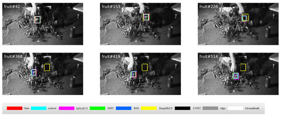 In Figure 12, the fruit moves above the leaves, causing a change in size making tracking difficult. The MHT, MFI-HVT, and the proposed algorithm take advantage of the spectral characteristics of the target and perform well in this sequence. However, CNHT substitutes too much background clutter in the tracking process leading to tracking failure at frame 153.