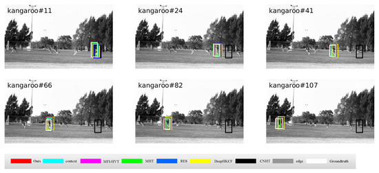 In Figure 14, there is some background interference due to the rapid jumping of the kangaroo and the similarity of the tracked kangaroo with other kangaroos. Most of the trackers perform well on this sequence as most of them use target features.