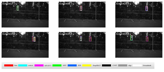 As an important branch of computer vision, target tracking [1,2,3,4] is widely used in pedestrian monitoring [5,6], robot navigation [7,8], regional control [9,10], and other fields. The target tracking algorithm estimates the state of the target in each frame after giving the position and size of the target in the video sequence’s first frame. Most of target tracking methods based on visible light videos use the shape, appearance, and color information to track the target. However, when the color of the target and the background color are similar, how to accurately and robustly track the moving target is a challenge.