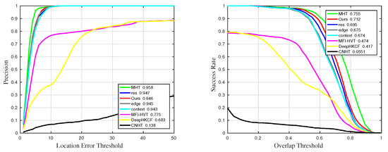 As shown in Table 2 and Table 3, the proposed algorithm almost achieves the top two performances in terms of the various indicators. On a whole, it achieves a precision of 0.941 and a success rate of 0.696, an improvement of 0.4% and 2.4%, respectively, compared with MHT. It may be noted that MHT is the current state of the art. The edge algorithm does not show strong robustness in the whole test due to the use of a single feature. Due to the usage of DECF and ICF, our algorithm yields a better result than the other algorithms against the BC challenge. The performances of the proposed algorithm are summarized in Figure 18 and the tables. Specifically, our algorithm achieves 91.8% precision and 71.4% success rate against the BC challenge, which are significant improvements in comparison with MHT and context algorithm. MFI-HVT gets the second highest score of 91.7% precision because of the use of multifeatures. The context algorithm achieved the second highest score with a 70.9% success rate. As for the context algorithm, the success rate is 0.5% lower than ours, and the precision is 0.2% lower than ours. This is because the filter of the context algorithm is not improved. Compared with RES algorithm, the success rate of our algorithm is improved by 3.4%, and the precision is improved by 0.7%. Moreover, compared with the edge algorithm, the success rate of our algorithm is improved by 1.3%, and the precision is improved by 0.6%. These two sets of experiments show that our algorithm with DECF is more efficient than the algorithm using one feature alone. MFI-HVT shows a poor performance of 77.5% precision and 47.4% success rate in the OPR challenge. The overall performance indicates that the MFI-HVT algorithm does not have strong robustness. Additionally, as is evident from Figure 19, when the target is obscured, our algorithm has a success rate 1.3% lower than MHT but ranks first in terms of precision. Although the consideration of material features in MHT facilitate adaptive target recognition, it fails for accurate scale estimation. As shown in Figure 20, our algorithm outperforms other algorithms owing to the adaptive scale estimation even when the target is affected by deformation. As shown in Figure 21, when the target is affected by OPR, the accuracy is only 1.2% lower and the success rate is only 4.3% lower as compared to MHT.