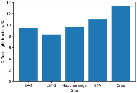 This paper is a continuation of our astroclimatic studies in the application of optical, millimeter and submillimeter astronomy [32,33,34]. We discuss the results of a quantitative analysis of atmospheric characteristics, including mean values, medians, mean absolute error, root mean square deviation and correlation coefficient [35,36,37,38]. The study is being carried out to determine the best sites for ground-based mm/submm telescopes as part of the ESMT Submillimeter Teselscopes (ESMT) project [34,39]. Within this project, it is planned to design three mm/submm telescopes in Russia, Uzbekistan and China. We should also note that our studies cover locations with low values of atmospheric diffuse light ranging from 8.3 to 13% (Figure 1). These locations are Baykal Astrophysical Observatory (BAO), Large Solar Telescope (LST-3), Big Telescope Alt-Azimuthal, Crimean Astrophysical Observatory and the Hapcheranga site [34,39].