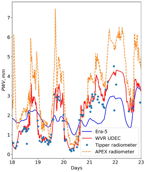 In order to determine how well the Era-5 reanalysis data reproduces real changes in precipitable water vapor, we used the data gathered from radiometer measurements at the Chajnantor Plateau [3]. Using Formula (2), we estimated the mean hourly PWV values within the Chajnantor Plateau. The Era-5-derived precipitable water vapor values are overestimated in comparison with the measurement data. We used the mean absolute error () for estimation of the PWV deviations assessed between the calculated and measured PWV: