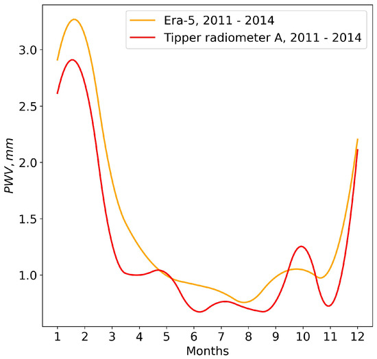 For longer averaging periods, consistency of PWV variations estimated from the Era-5 data and the data of the radiometric measurements improves. Figure 4 shows the changes in the mean monthly PWV values estimated from Era-5 data and the changes in the mean monthly measured radiometric PWV values. PWV values are averaged from 2011 to 2014. Statistics of PWV variations estimated from the Era-5 reanalysis data and radiometric data are shown in Table 2. In addition to the mean absolute error estimated for the hourly PWV values, we also estimated the RMS and the correlation coefficient between the PWV time series. Compared to intrahour variations, the mean absolute error of the mean monthly variations in PWV decreases to 0.23 mm, and the RMS decreases to 0.28 mm. The correlation coefficient is 0.97.