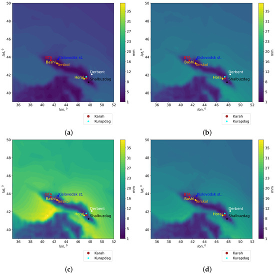 With the aim of identifying the sites suitable for astronomical observations in the mm/submm wavelength range, we obtained spatial distributions of PWV within the BTA region. We used the Era-5 reanalysis data for mapping. The spatial distributions of PWV averaged for the period 2010–2020 for different seasons are shown in Figure 5. PWV averaging was performed using Formula (7):