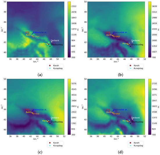Spatial distributions of cloud base height for different seasons for the period 2010–2020: (a) winter; (b) spring; (c) summer; (d) autumn.