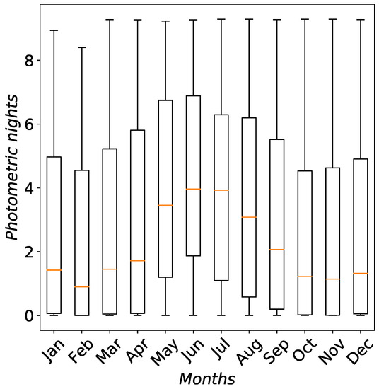 In order to estimate the number of photometric and spectroscopic nights as well as nights with cloud coverage lower than or equal to 50% at the BTA site, we used hourly Era-5 data from 2010 to 2022. The duration of a night at a site is counted from an hour after sunset to an hour before sunrise. Figure 9 and Figure 10 show box and whisker plots for photometric spectroscopic nights for 2010–2021. Table 5 summarizes the number of nights estimated with different thresholds for the cloud coverage at the BTA site. At the BTA site, the averaged number of spectroscopic nights per year estimated from long-term reanalysis data is 67.8 (71.2 for nights with cloud coverage lower than or equal to 50%). The number of photometric nights is less (it is equal to 25.3 per year).