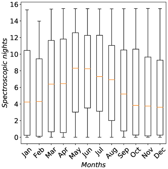 Box and whisker plots for spectroscopic nights during 2010–2021 at the BTA site. The central horizontal lines inside the boxes are medians; bottoms and tops of the boxes are ± standard deviation; and ends of the whiskers are the minimum and maximum values.