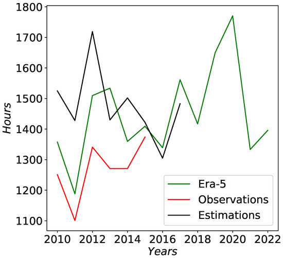 In addition, we compared the annual changes in amount of hours from visual observations at the BTA [45] with the hours estimated from Era-5 reanalysis data. Figure 11 shows annual changes in the amount of hours from visual observations at the BTA with the hours estimated from Era-5 reanalysis data. For spectral nights, the Era-5 data have the best agreement with visual observations at a threshold of 0.5. The total observing time at the BTA is 1453 h per year (Table 6). As Table 6 shows, one of the best sites in Dagestan, namely Mt. Kurapdag, is characterized by a large number of observation hours. The mean number of hours for the period from 2010 to 2021 was 1971 h.
