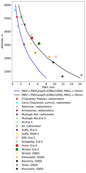 In the calculations, we used the exponential dependence of PWV on the altitude [49]. Figure 13 shows the correspondence between medians of PWV and site elevation.