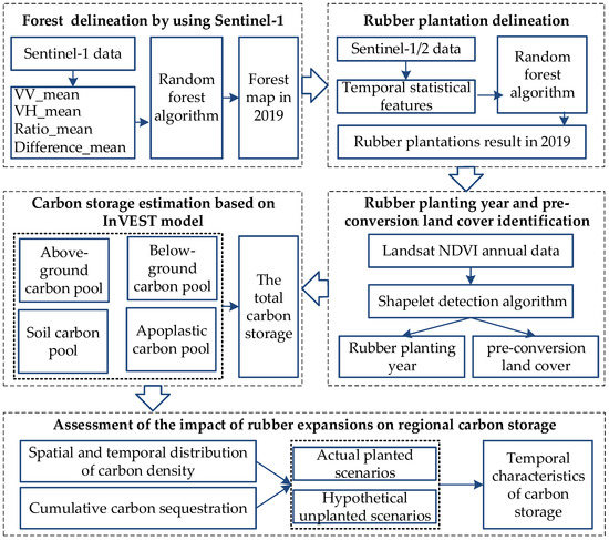 A systematic approach for quantitatively assessing the impact of rubber expansions on regional carbon storage was proposed in this study. Our method consisted of five main stages (Figure 2): (1) mapping the forest distribution of 2019 using Sentinel-1 time-series satellite data; (2) extracting the rubber forest by integrating Sentinel-1 and Sentinel-2 data; (3) identifying the rubber planting year and pre-conversion land cover; (4) estimating the carbon storage using the InVEST model; and (5) assessing the impact of rubber expansions on regional carbon storage under actual planted and hypothetical non-rubber-planted scenarios.