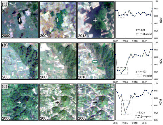 As shown in Figure 3, the dashed rectangles represent the detected shapelet of the rubber time series. Because of the absence of disturbance in the intact rubber plantation example, the NDVI value of the shapelet was very similar to that of the non-shapelet (Figure 3a). Accordingly, the discrepancy between its shapelet and non-shapelet segments was low with t * = 1.521, which was lower than the threshold (t = 2.552). Figure 3b shows an example of rubber plantations converted from cropland and Figure 3c shows rubber plantations planted after natural forests were cut down. These two rubber plantation conversion scenarios had a relatively longer period of consistently and significantly low NDVI values of non-vegetated timespan, which is related to the land clearing, land preparation, and open canopy period typical of juvenile rubber tree cover. As a result, the t test showed that the rubber plantation pixels with planting events had a t statistic (t * = 16.423 and t * = 5.428) higher than the threshold.
