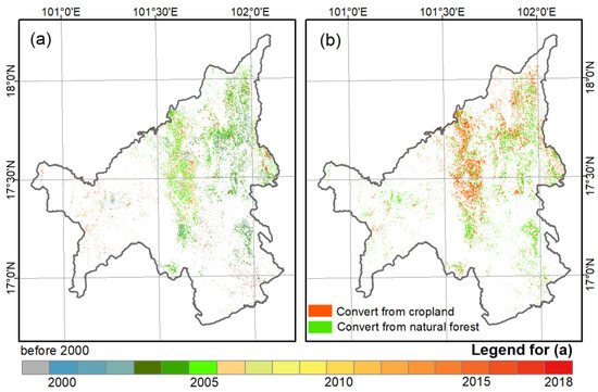 (a) Planting year estimation, and (b) pre-conversion land-cover types of cropland and natural forest in Loei Province.