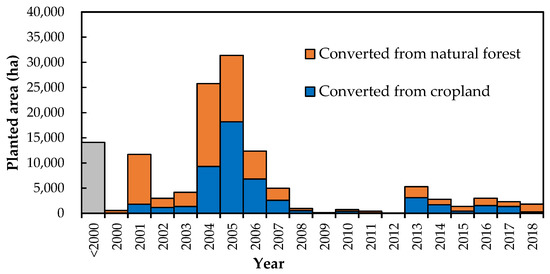 Most of the total newly established rubber plantations in Loei Province were converted from cropland, accounting for 54.81% (61,708.75 ha), while 45.19% were converted from natural forests (50,871.24 ha). Before 2004, rubber was planted mainly by encroaching on cropland. The conversion from natural forests began to increase after 2004, and the conversion area of natural forests was larger than that of cropland in 2005–2007 and 2013–2017.