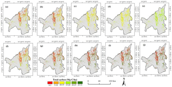 Spatial and temporal pattern distribution of carbon density in Loei Province (where (a–e)/(f–j) correspond to 1999, 2004, 2009, 2014, and 2018, respectively; (a–e) and (f–j) represent the scenarios under actual rubber plantations and hypothetical non-rubber plantations, respectively).