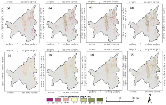 Spatial and temporal patterns of cumulative carbon sequestration in different periods (corresponding to 1999–2004, 2005–2009, 2010–2014, and 2015–2018; (a–d) and (e–h) represent the cumulative carbon sequestration under actual rubber planting and hypothetical no-rubber-planting scenarios, respectively).
